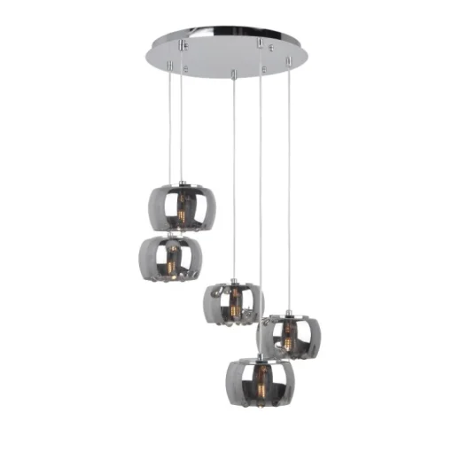 La lámpara colgante Jimena 5l es una lámpara de estilo moderno. Su estructura es de metal acabado cromo. Sus tulipas están realizadas en vidrio ahumado efecto espejo. Dentro de ellas, cuelgan unas lágrimas con forma de gotas de distintos tamaños, en cristal transparente. La altura es regulable a la hora de la instalación de cada una de ellas. Jimena es compatible con bombillas led (no incluidas). Jimena está disponible en otros formatos. Podemos utilizar Jimena 5l para iluminar por ejemplo un salón un dormitorio e incluso un hueco de escalera.