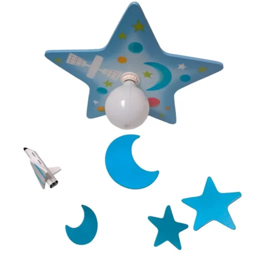 Lámpara colgante infantil en madera con motivos de estrellas , nubes y cohetes espaciales.Compatible con bombillas incandescentes , bajo consumo o led ( bombilla no incluida). Disponible en acabado multicolor.