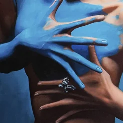 Lienzo modelo Alma. Este lienzo tiene impresa la imagen al detalle de un busto femenino en tonos azules y negros. Su marco es de DM y esta realizado en acabado plata y negro. Sus dimensiones son 80cm de largo, 3.5cm de grosor y 120cm de alto. Su peso es de 2.6kg.