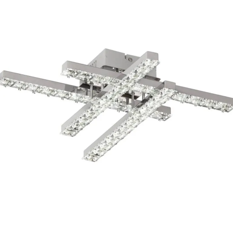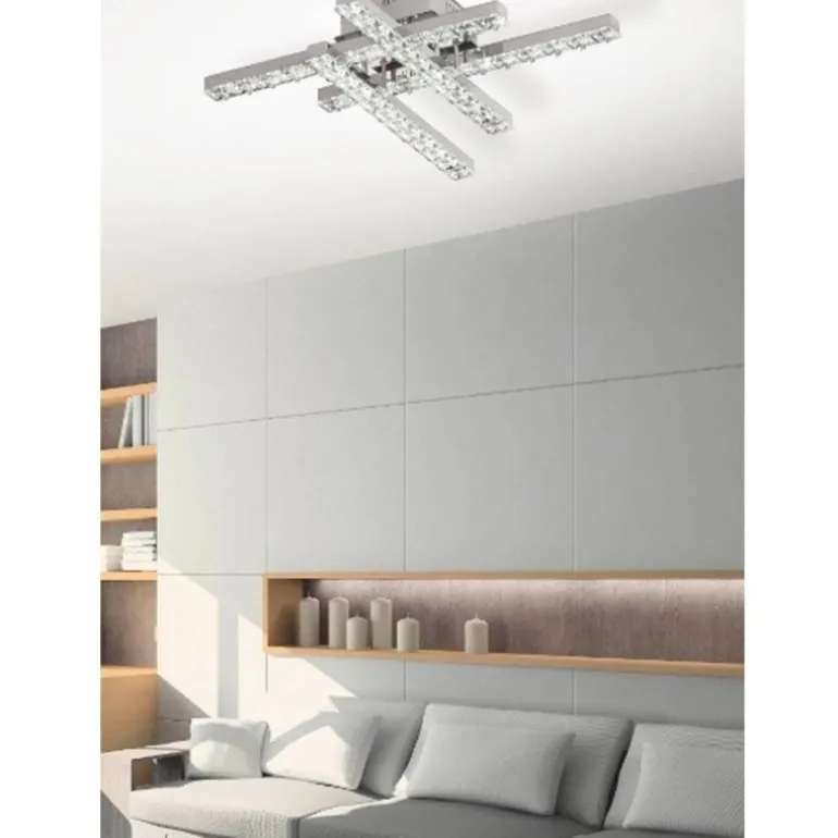 Original plafón para techo modelo Brno . Se compone de materiales como acero inoxidable, hierro y pequeños cristales transparente cuadrados, que le dan el toque original. Brno tiene integrado led de 28w consumo (2100lm) y su tonalidad es de 4000k (luz neutra). Es una buena opción si necesitas iluminar un dormitorio, recibidor También está disponible en tamaño superior.